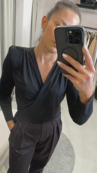 Bluzka Maesta Nero to elegancki model, który łączy w sobie kobiecą lekkość i nowoczesny charakter. Wykonana z lejącego, miękkiego modalu, pięknie układa się na sylwetce, tworząc naturalne, płynne drapowania. Precyzyjne marszczenia w okolicy dekoltu oraz subtelne ułożenie materiału w talii nadają całości harmonijną, wysmuklającą linię.