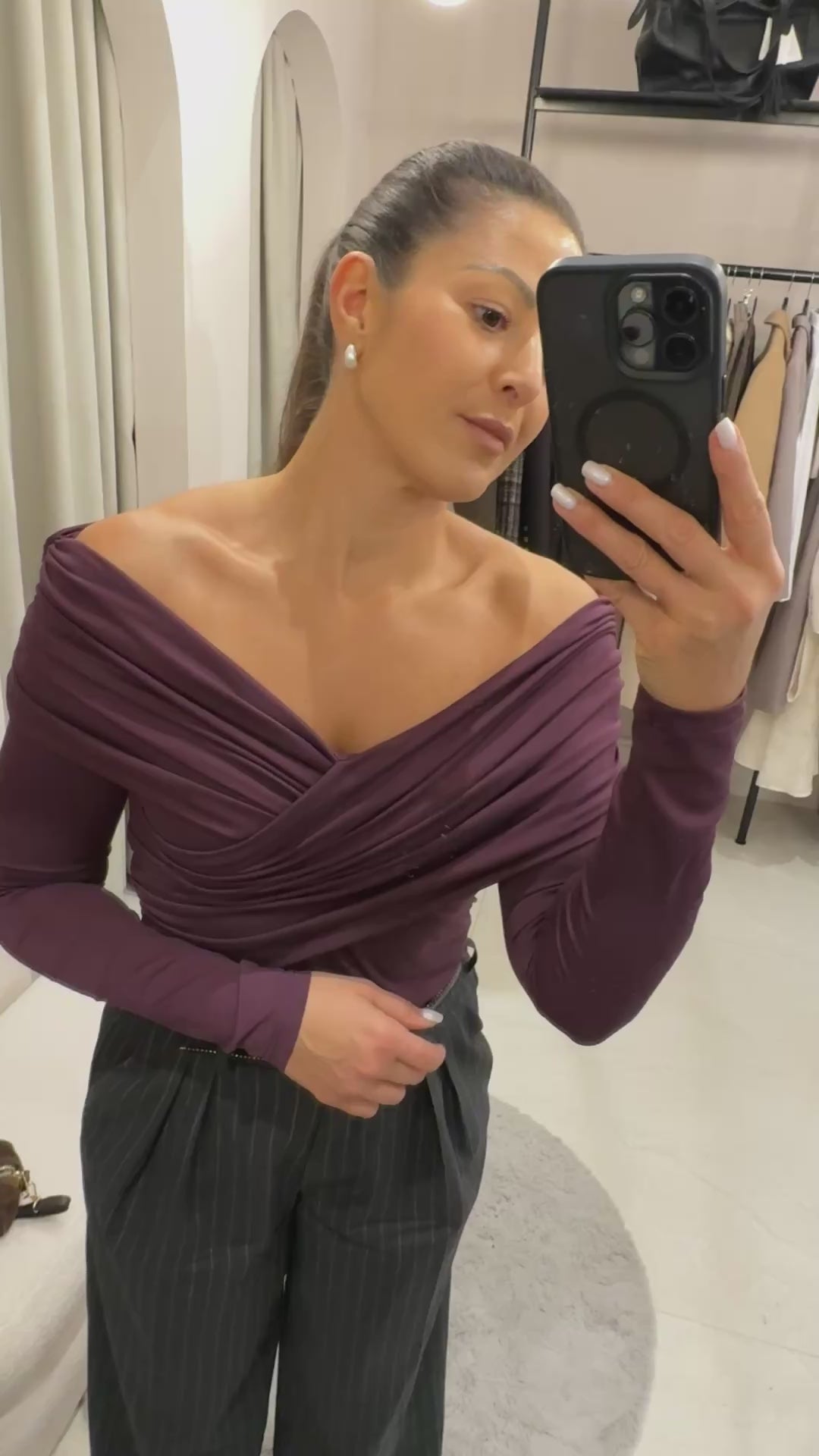 Charakterystycznym elementem modelu jest zmysłowy, drapowany dekolt który delikatnie opada na ramiona, ale nie zsuwa się z nich, co gwarantuje komfort noszenia. Drapowania tworzą efektowne krzyżowanie materiału z przodu, subtelnie podkreślając linię biustu i talii. Długie, dopasowane rękawy równoważą całość i nadają bluzce wyszukany, wieczorowy charakter.
