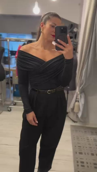 Charakterystycznym elementem modelu jest zmysłowy, drapowany dekolt który delikatnie opada na ramiona, ale nie zsuwa się z nich, co gwarantuje komfort noszenia. Drapowania tworzą efektowne krzyżowanie materiału z przodu, subtelnie podkreślając linię biustu i talii. Długie, dopasowane rękawy równoważą całość i nadają bluzce wyszukany, wieczorowy charakter.