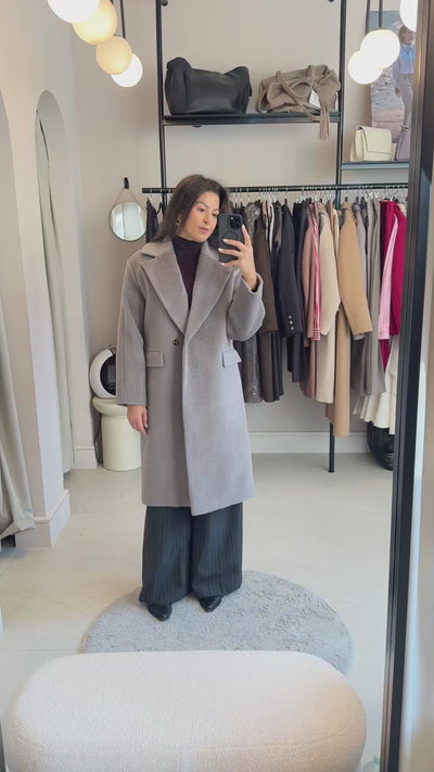 Model został uszyty z włoskiej alpaki z dodatkiem wełny jagnięcej – tkaniny niezwykle miękkiej, lekkiej i jednocześnie znakomicie grzejącej. Fason oversize z delikatnym taliowaniem zapewnia wygodę, swobodę ruchu i nowoczesny charakter, a dwie boczne kieszenie i zapięcie na zatrzaski podkreślają jego funkcjonalność. Płaszcz został dodatkowo ocieplony, a jego wnętrze wykończone jest wiskozową podszewką z ozdobną wypustką.
