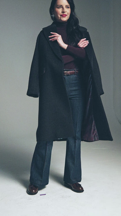 Płaszcz Espresso to zimowa klasyka z nutą nowoczesnego luzu. Uszyty z wyjątkowo miękkiej i ciepłej wełny alpaki w odcieniu głębokiego antracytu, otula sylwetkę elegancką formą oversize, zachowując przy tym szlachetne proporcje.
