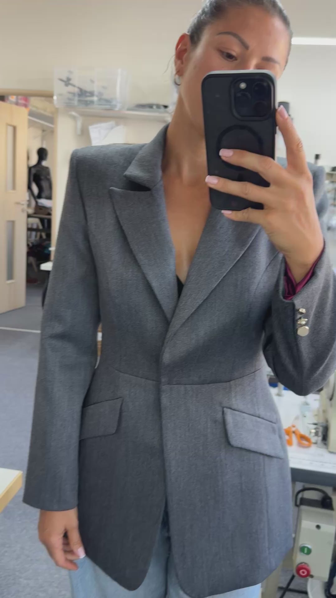 Mocno taliowany fason podkreśla sylwetkę w kształcie klepsydry, a lekko poszerzone ramiona z ekskluzywnymi poduszkami - nadają całości nowoczesnej linii. Ręcznie dobrane, złote guziki o biżuteryjnym charakterze stanowią unikatowy detal, który podkreśla luksusowy charakter projektu.